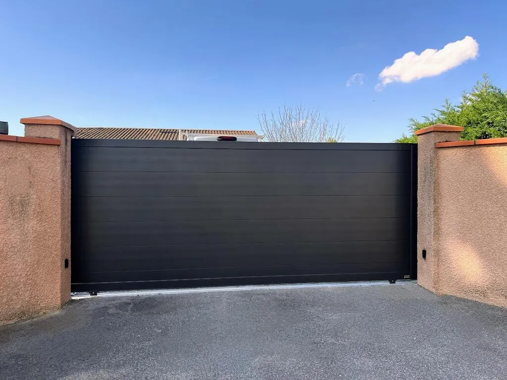 Portail aluminium coulissant gamme Cépage, modèle Merlot avec lame large de 280mm.